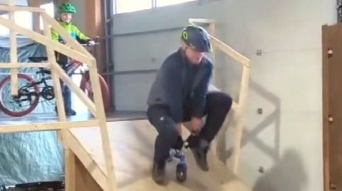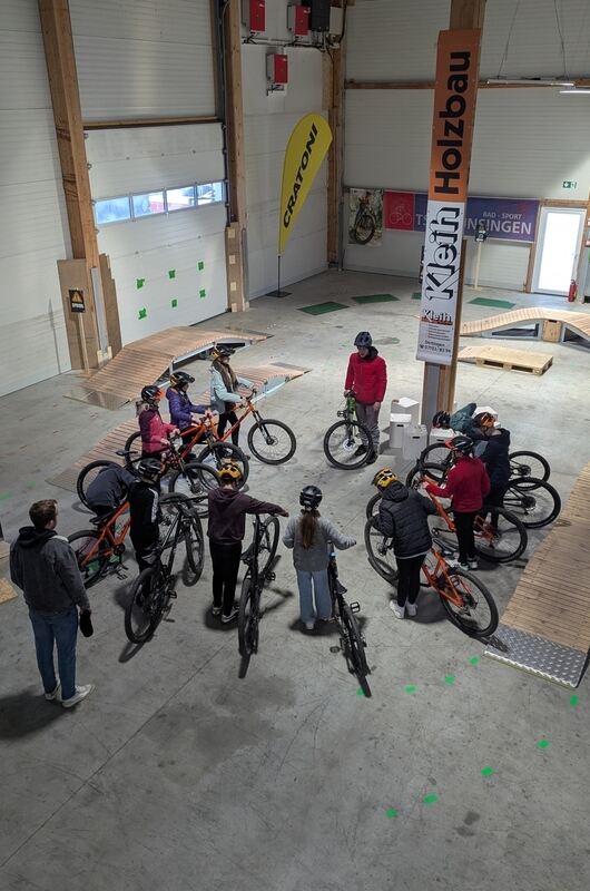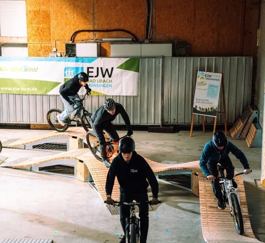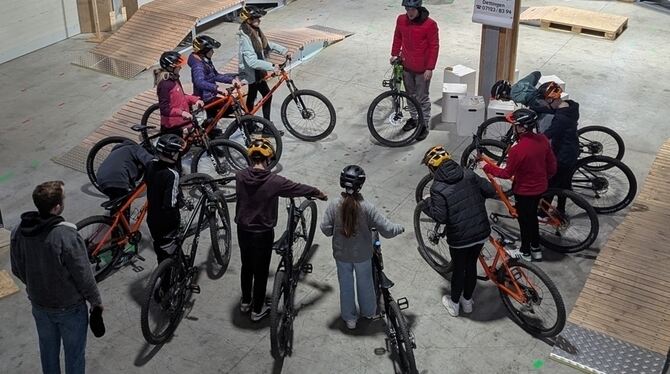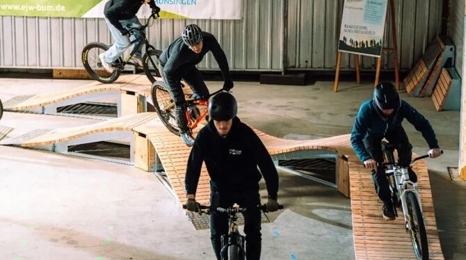 Radbeherrschung wie aus dem Bilderbuch: Samuel Löffler (Mitte), der Kopf des Mountainbike-Projekts »erFAHRBAR« im Münsinger Industriegebiet, zwischen Levin Prochiner (links) und Tobias Beck. FOTO: FINK