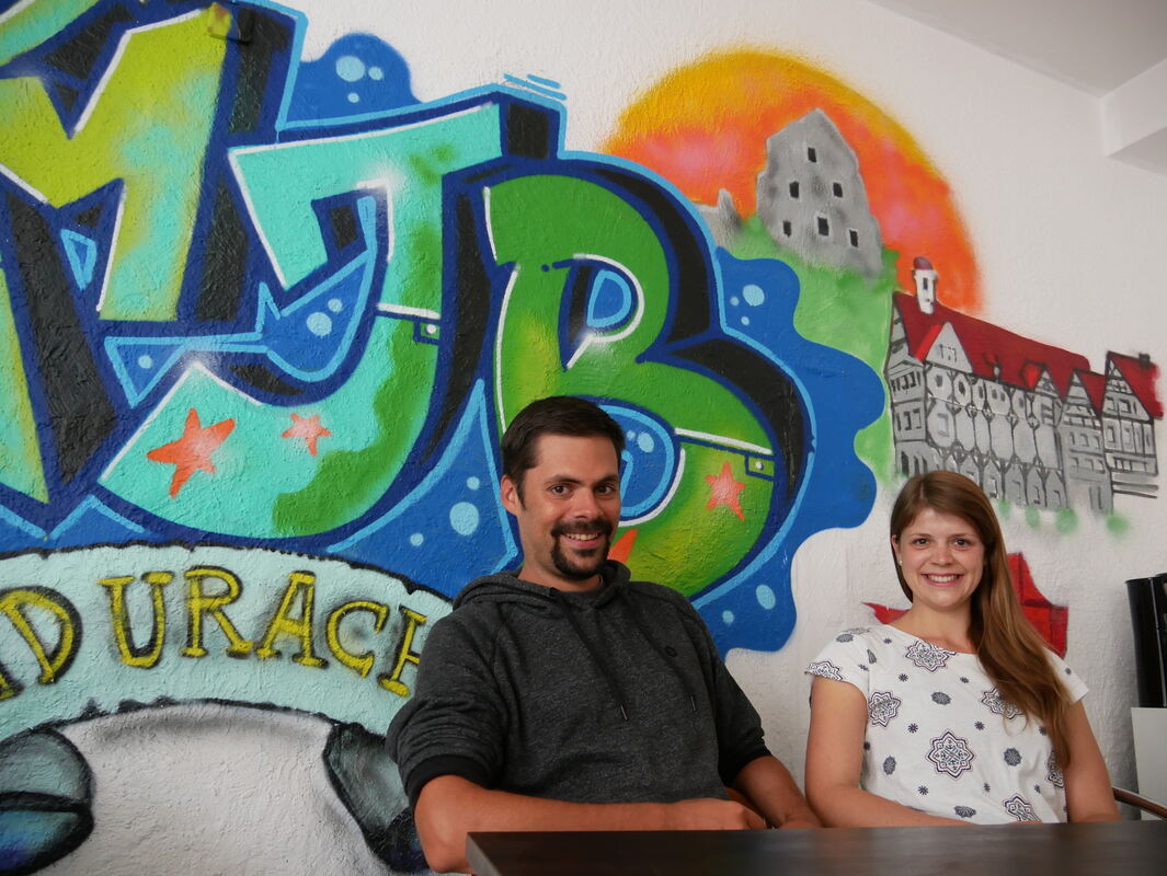 Kolja Kaspczyk und Corina Schneider sind seit drei Jahren die Gesichter der Mobilen Jugendberatung in der Neuen Straße 15 in Bad Urach. Das Graffiti im Hintergrund mit dem MJB-Logo, dem Hohenurach und dem Rathaus ist Anfang 2017 zusammen mit Jugendlichen mit der Unterstützung eines Graffiti-Künstlers entstanden. foto: fink