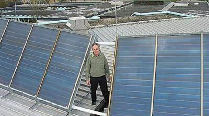 Physiklehrer Albrecht Raupp vor einer Solartherme. Die geplante große Photovoltaikanlage soll auf den Kiesdächern im Hintergrund installiert werden.