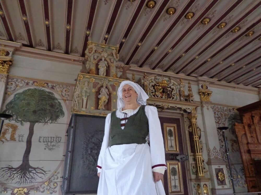 Im goldenen Saal von Schloss Urach: Johanna Kugele als respektlose schwäbische Kammermagd Barbara, seit zehn Jahren eine der meistgebuchten Führungen. FOTO: KUNZE