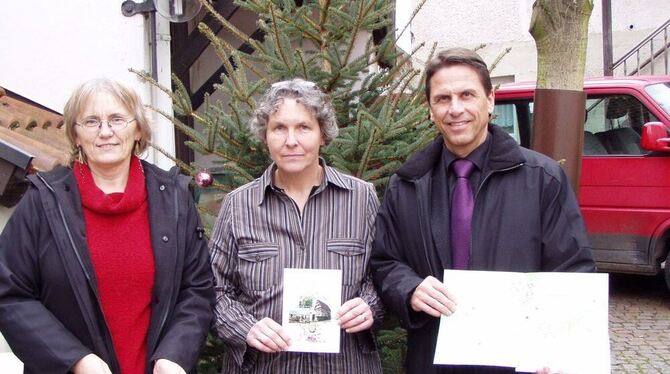 Angelika Lindauer (ganz links), Hannelore Adam und Pliezhausens Bürgermeister Christof Dold präsentieren die neue Broschüre zur Ortshistorie