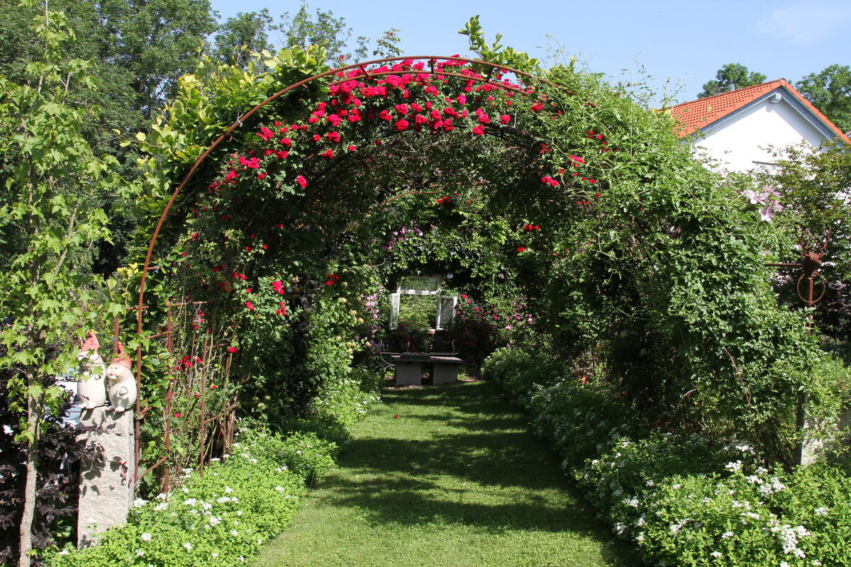 Ein Traum zur Hauptblütezeit: Laubengang mit Rosen und anderen Kletterpflanzen.