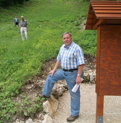 Gerhard Schwenninger, der Vorsitzende des Verschönerungsvereins Bad Urach (rechts) steht neben der Tafel an der Hermann-Greiner-Schanze, die am 26. Mai, eingeweiht wird. Im Hang sein Mitstreiter Karl-Heinz-Ulbricht. Im Hintergrund Bürgermeister Elmar Rebmann.