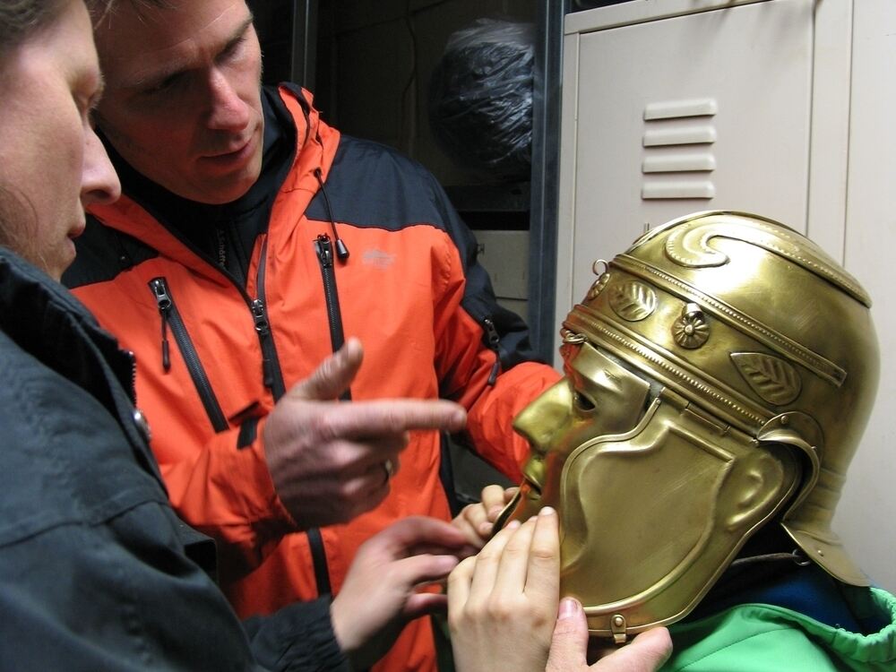 Behelmt wie ein römischer Legionär: Hannes Veit ließ sich von Monika Zimmermann (links) und seinem Vater David ausstaffieren. FOTO: MAZ