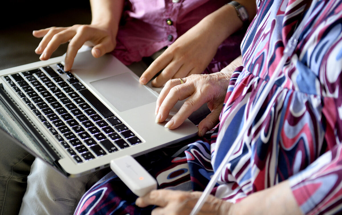 Die Hände einer jungen Frau und einer Seniorin berühren einen Rechner. Zusammengebracht hat die beiden in Hannover Lebenden das Projekt »Wohnen für Hilfe«.