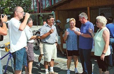 Wasserprobe auf dem Metzinger Marktplatz: Wie Rolf Rickborn (links) und Metzingens OB Dieter Hauswirth (Zweiter von rechts) konnten alle einen Schluck aus diversen Quellen kosten.