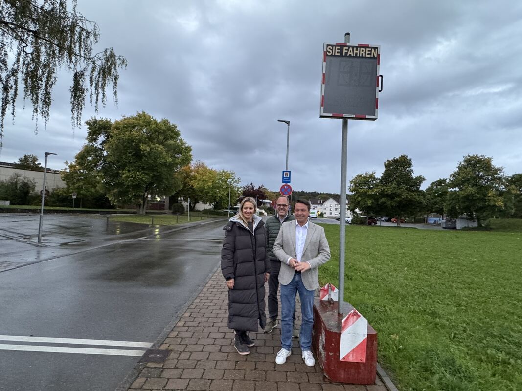 Ortstermin vor der Gutenbergschule mit Katrin Juchem, Robert Vitt und Manuel Hailfinger. Seit Schulbeginn steht neben der Straße eine sogenannte Geschwindigkeitsanzeigetafel, die misst, wie schnell vor der Schule gefahren wird. FOTO: RUOF