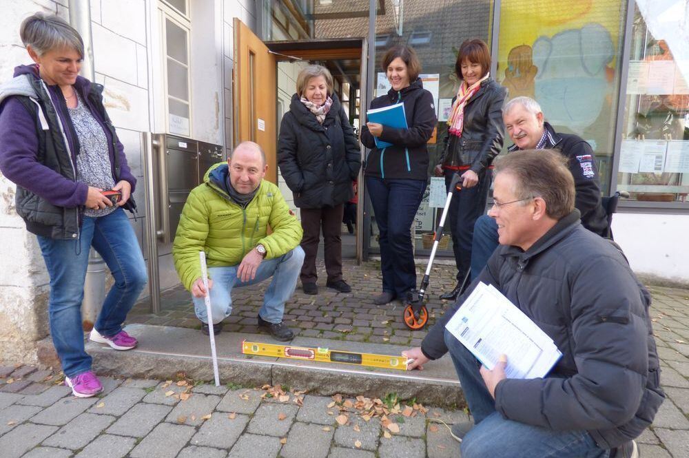Die Metzinger Inklusionsbeauftragte Ute Kern-Waidelich (links) nimmt mit einer Gruppe ehrenamtlicher Helfer die Stufe vor dem Klosterhof in Augenschein. FOTO: BÖRNER