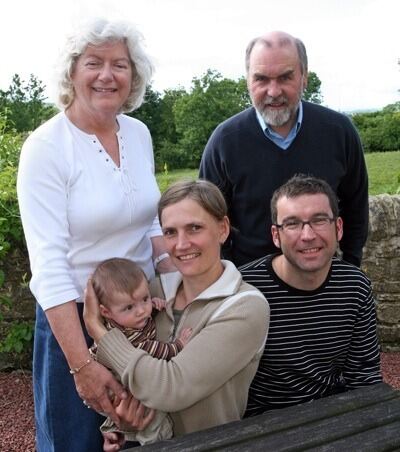 Deutsch-englische Freundschaften, die einiges mit der Städtepartnerschaft Metzingen-Hexham zu tun haben. Im Hintergrund Joan und John Proudlock, vorne Marika Bakonyi mit Baby Aniko Ella und Ehemann Hans Walcher.