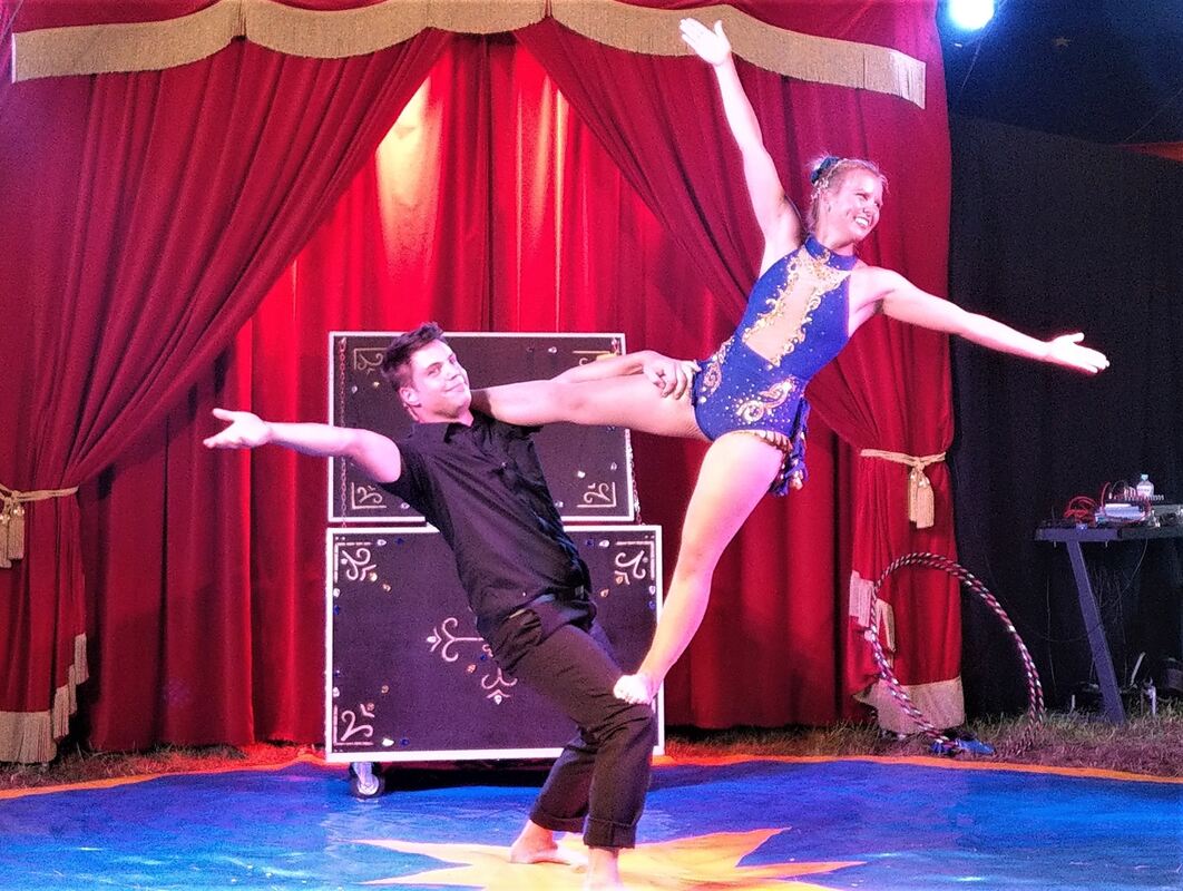 Bella, zunächst in rotem Frottee, wandelt sich blitzschnell in eine schicke Artistin in blauem Dress. Mit einem unter der Zirkuskuppel hängenden Mond zeigt sie in ihrer Trapeznummer absolute Körperbeherrschung und klettert später auch an Seidenbahnen hoch hinauf. »Jetzt holt Bella einen Stern von der Kuppel!«, ruft ein Mädchen begeistert. Kein Zweifel, die Kinder haben ihre Lehrmeister, das sympathische Zirkuspaar, längst ins Herz geschlossen.