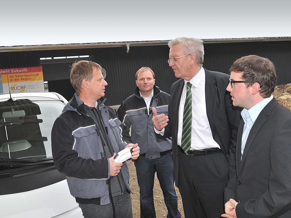 Meinungsaustausch über Energiepolitik und die unbestreitbaren Vorteile erneuerbarer Energien vor dem ersten, serienmäßig gebauten Elektroauto, einem Mitsubishi (von links): Uli Ruoff, Karsten Lindner, Winfried Kretschmann und Dominic Esche.