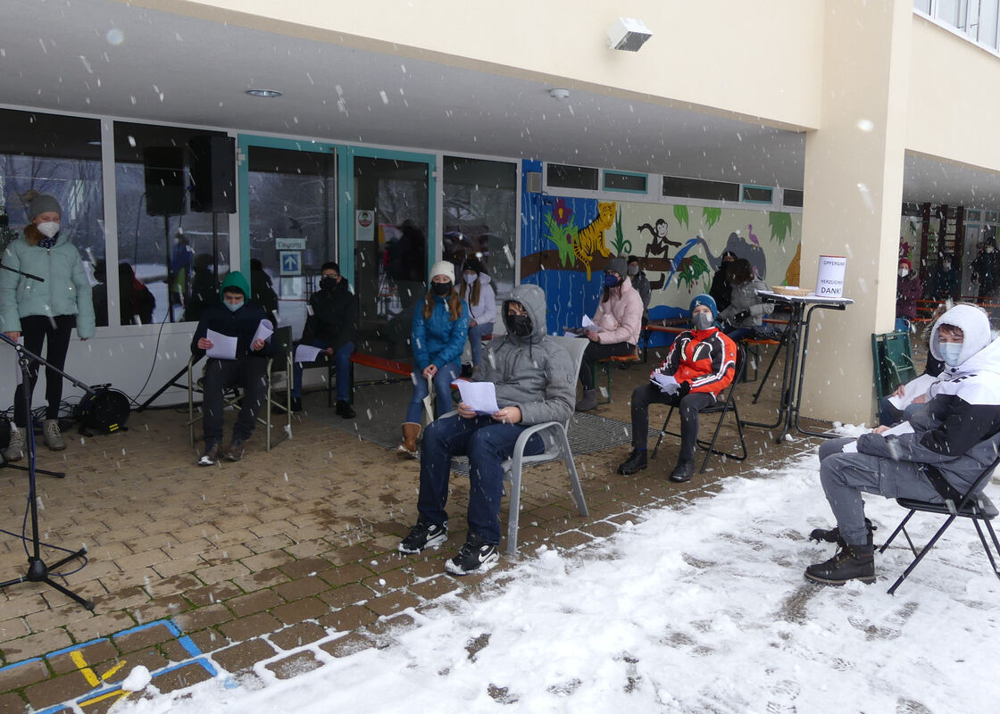 Nicht nur Konfirmanden sind in Grafenberg wetterfest, auch Erwachsene kamen trotz Schneefalls zum ersten Freiluft-Gottesdienst in diesem Jahr auf den Schulhof. Nicht alle hatten Platz unter der Überdachung im Pausenhof, also saßen und standen einige auch komplett im Freien, um die Coronavorschriften einhalten zu können. FOTO: SANDER
