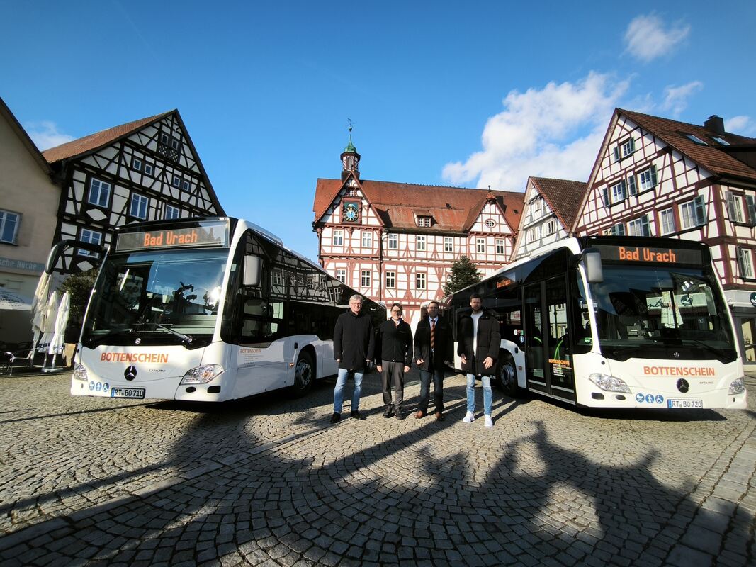Im Bad Uracher Stadtverkehr gibt es zwei neue Busse. Im Bild: (von links) Bad Urachs Bürgermeister Elmar Rebmann, Bottenschein-Geschäftsführer Horst Bottenschein, sein Laupheimer Betriebsleiter und Prokurist Jürgen Schneider und Jan Heidemann, der stellvertretende kaufmännische Betriebsleiter der Stadtwerke Bad Urach, der für den Stadtverkehr verantwortlich ist.