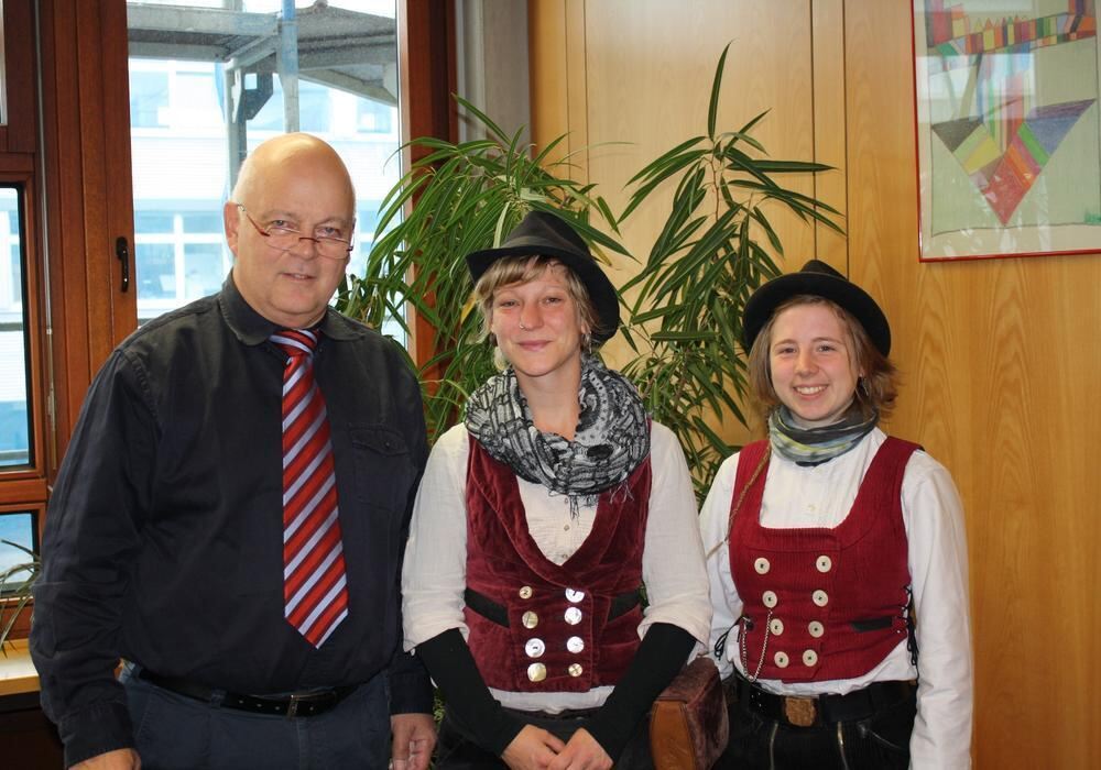 Schulleiter Roland Kiesel mit den beiden frei reisenden Schneiderinnen Tini und Ann-