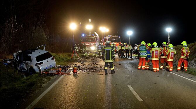 GRAFENBERG. Auf der B313 zwischen Großbettlingen und Grafenberg kam es am Montagabend um 20.45 Uhr zu einem schweren Verkehrsunfall. Zwei Autos waren beteiligt, beide Fahrer sind bei dem Unfall ums Leben gekommen. Nach Polizeiangaben fuhr ein 55-jähriger Mann in Richtung Grafenberg und kam aus bislang ungeklärter Ursache in einer Rechtskurve auf die Gegenfahrbahn. Er stieß frontal mit dem Auto eines 21-jährigen Mannes zusammen. Beide Männer erlagen noch am Unfallort ihren schweren Verletzungen.