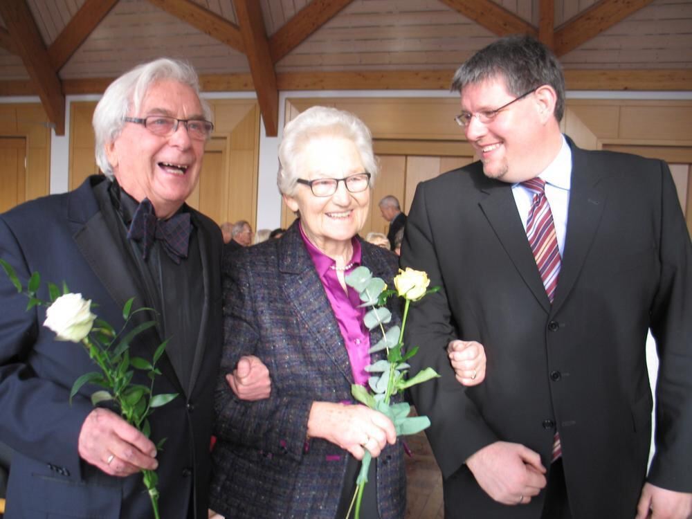 OB Dr. Ulrich Fiedler gratuliert Dr. Horst Laubner und Eva Maria Weiblen. FOTO: SCHÖNECK