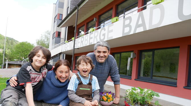 Können es kaum erwarten, bis es in der Uracher Jugendherberge endlich wieder losgeht: die Herbergseltern Cornelia Dreher und Luis Molina mit ihren Söhnen Dominik (links) und Vincent. Die Erdbeer-Pflänzchen werden als Deko und zum Naschen gepflanzt. FOTO: FINK