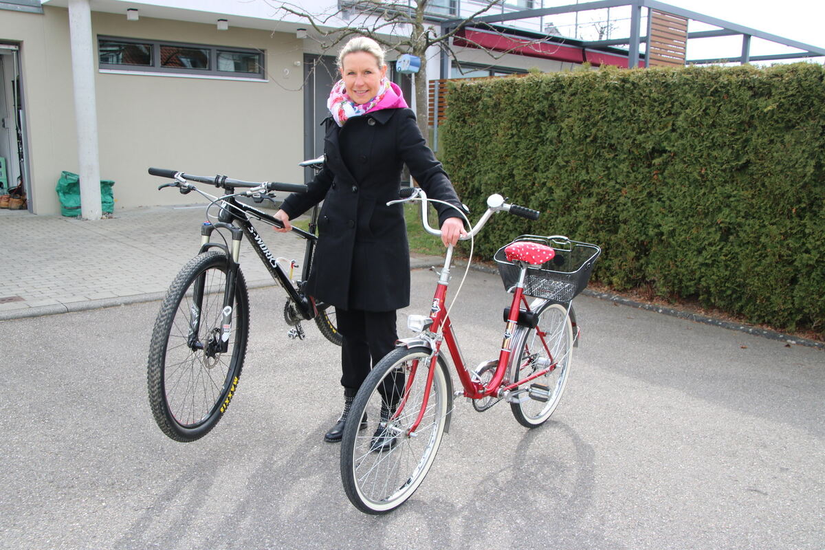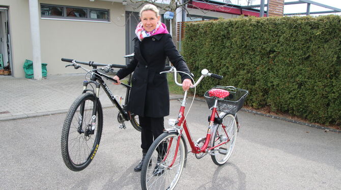 Anja Köhnlein-Spindler aus Dettingen mit ihren zwei Rädern: Das eine ist ein leichtes Hightech-Produkt, das andere ein altes Klapprad. FOTO: OECHSNER