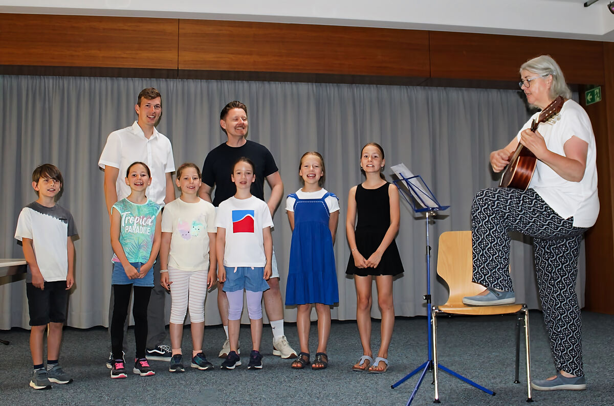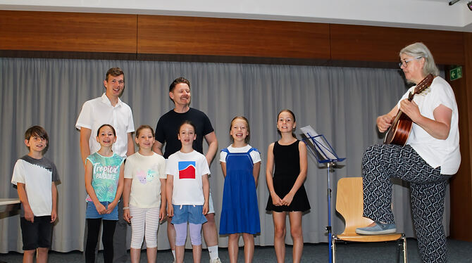 Diese Gruppe von fünf Schülerinnen und einem Schüler sang die offizielle Version der neuen Schulhymne. Geschrieben hatte sie Markus Sosnowski (hintere Reihe Mitte), eingeübt Bettina Freise. Für die Technik sorgte Christian Franz (hintere Reihe links).