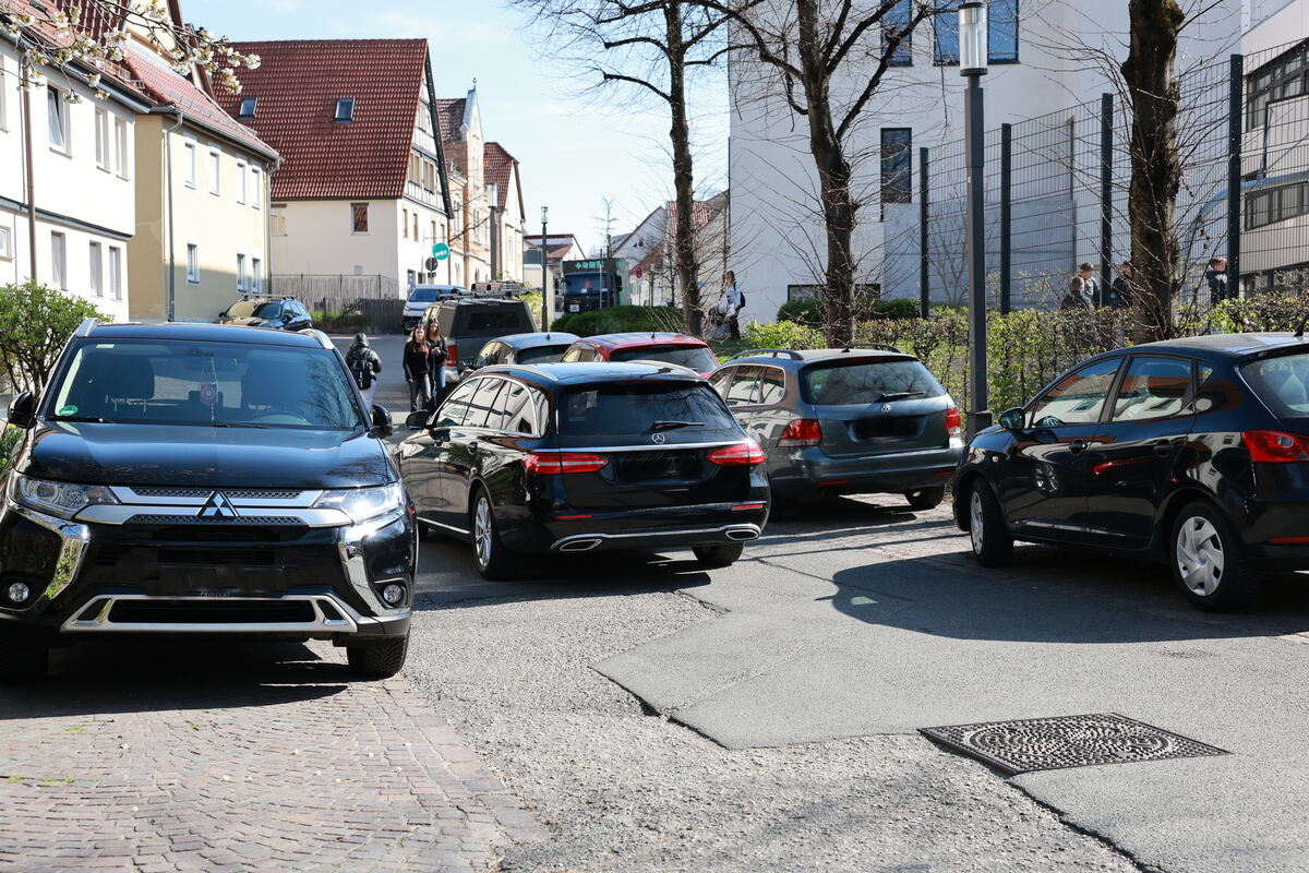 Freies Parken in der Schlossstraße. Engstelle vor der Wilhelm-Hauff-Realschule. Foto: Dieter Reisner
