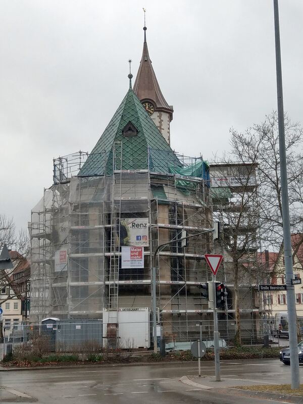 Jetzt werden Fassade und Dach des Chors der Martinskirche saniert. FOTO: BÖHM