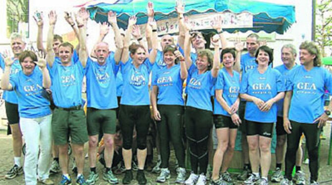 Beim Pfullinger Maimarkt präsentierten sich die Läufer im nagelneuen Staffellauf-Shirt gut gelaunt der Öffentlichkeit. Am Freitag in einer Woche wird bei der Pasta-Party im »Olympic« nochmal Energie getankt, am nächsten Morgen um 8 geht's dann los in Richtung Passy.