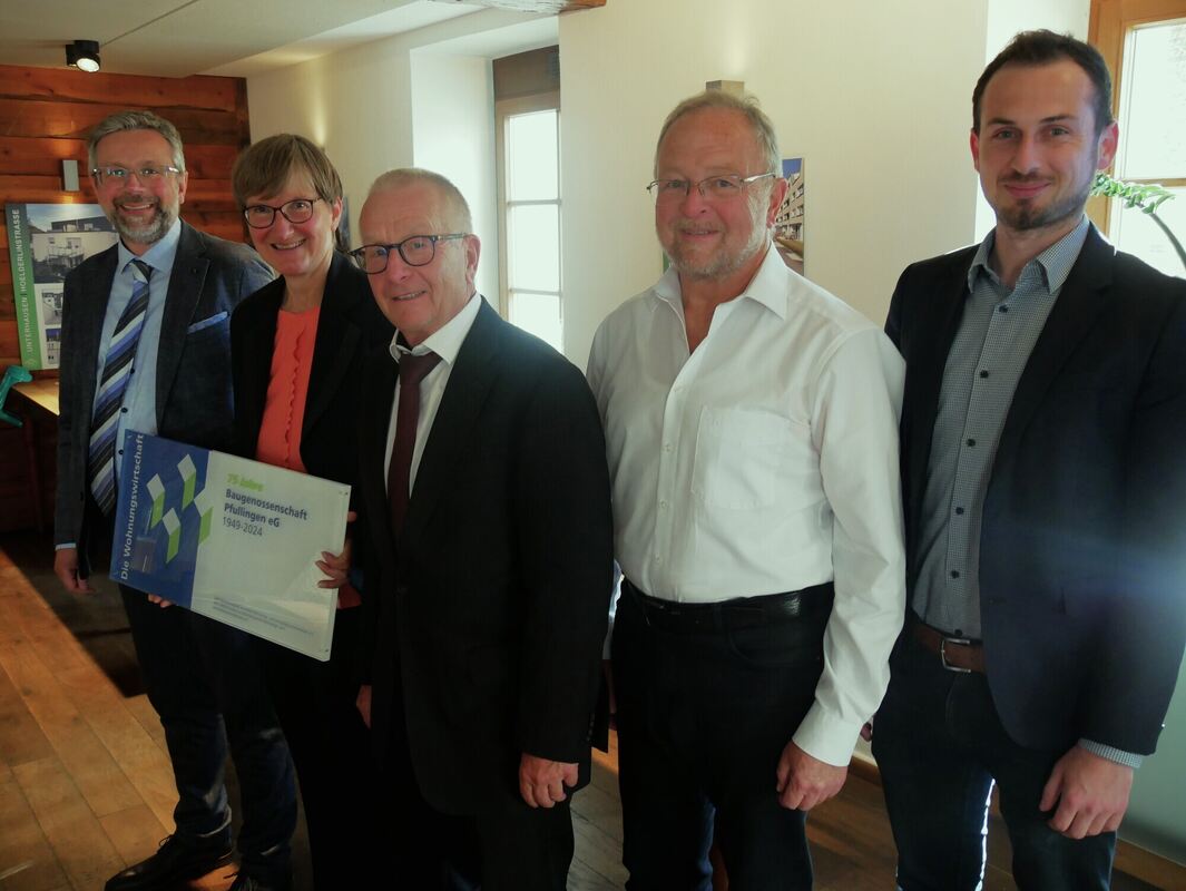 Sie stehen heute für 75 Jahre erfolgreiche Geschichte der Pfullinger Baugenossenschaft, (von links) Martin Grado, Gastrednerin Dr. Iris Beuerle, Manfred Wolf, Hans-Ulrich Kieffer und Manuel Baier.
