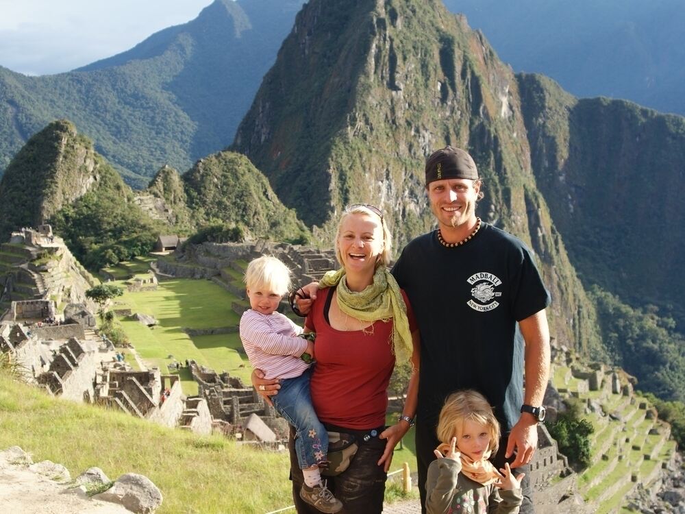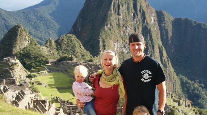 Vor dem Machu Picchu in Peru: Birgit und Heiko Baron mit ihren Töchtern Paula (unten) und Mina. FOTO: PR