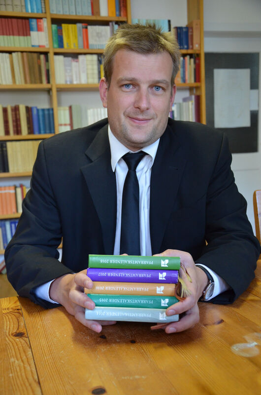 Pfarrer Dr. Martin Bauspieß hält die Zeit in Lichtenstein in Händen. Der fünfte Pfarramtskalender hat demnächst seine Schuldigkeit getan. Am 1. Oktober tritt Bauspieß eine neue Stelle an. Die Verabschiedung ist am Sonntag, 23. September, um 9.45 Uhr in der Honauer Galluskirche. FOTO: SAUTTER