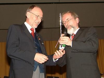 Bürgermeister Rudolf Heß ehrt Winfried Kaldschmidt (links) mit einem Dirigentenstab aus Silber.