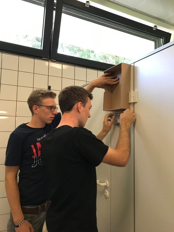 Michael Schwarz (links) vom JGR und sein Bruder Tobias haben etliche Aufkleber in den Toiletten des FSG und an der WHR angebracht. Dort werden die Schüler jetzt darauf hingewiesen, achtsam mit dem Inventar des »stillen Örtchens« umzugehen.