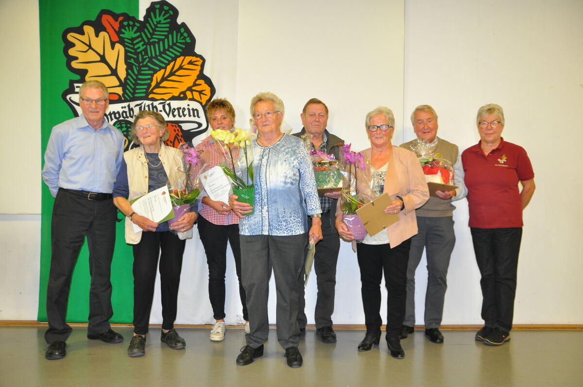 Teamsprecher Peter Haag mit den langjährigen Mitgliedern Gudrun Epple, Susanne Redies, Helene Preusch, Robert Wollwinder, Helga Bader, Herbert Mühl und Marlies Sautter (von links). FOTO: BIMEK