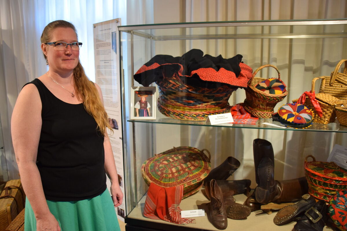 Museumsleiterin Anke Niklas zeigt in der Sonderschau auch eine Schiede, einen großen Korb, der auf dem Kopf getragen wurde.