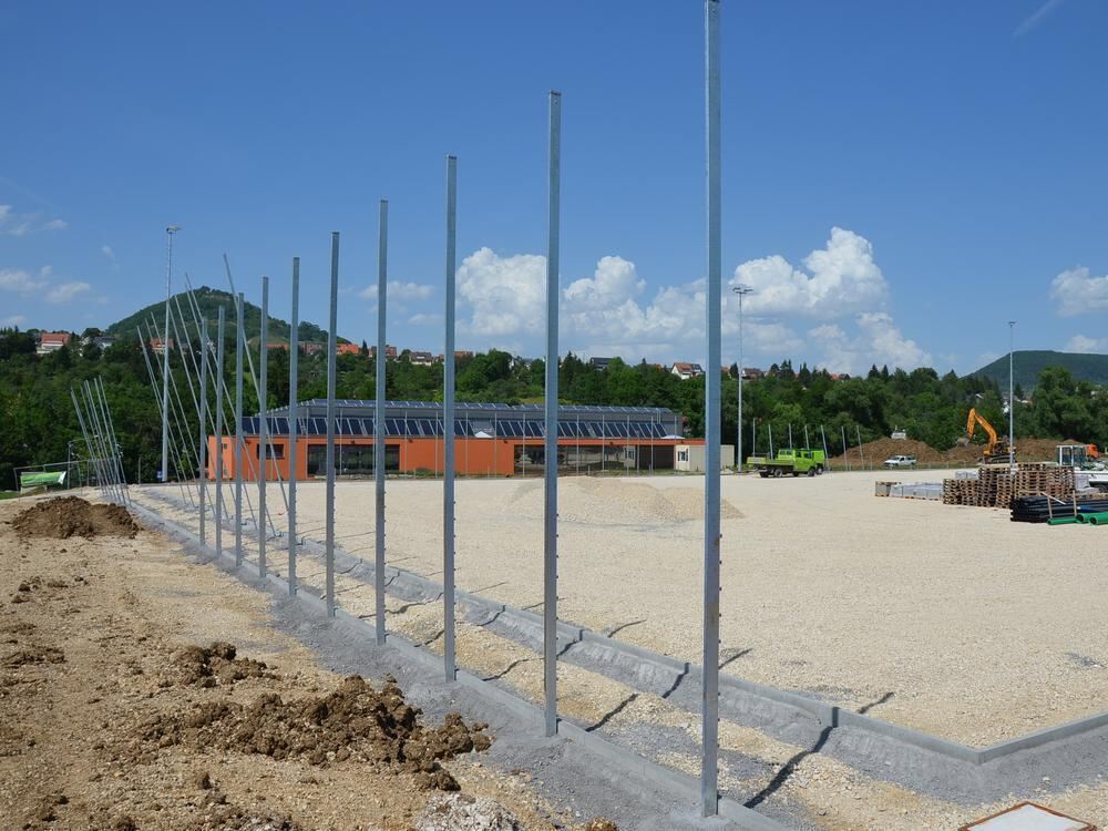 Die Netze muss man sich noch dazudenken: die Ballfanganlagen auf dem neuen Sportgelände im Arbachtal.