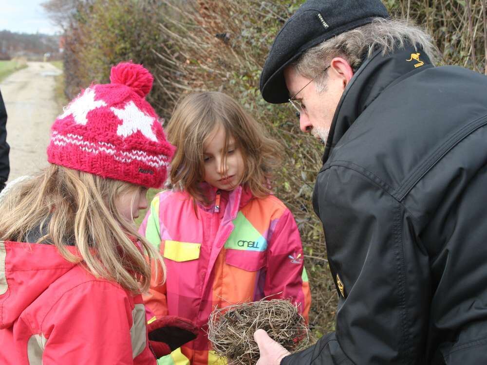 Interessantes am Wegesrand: Bürgermeister Rudolf Heß zeigt den Kindern beim Spaziergang durch die Echazaue ein Amselnest. FOTO: SCHEURER