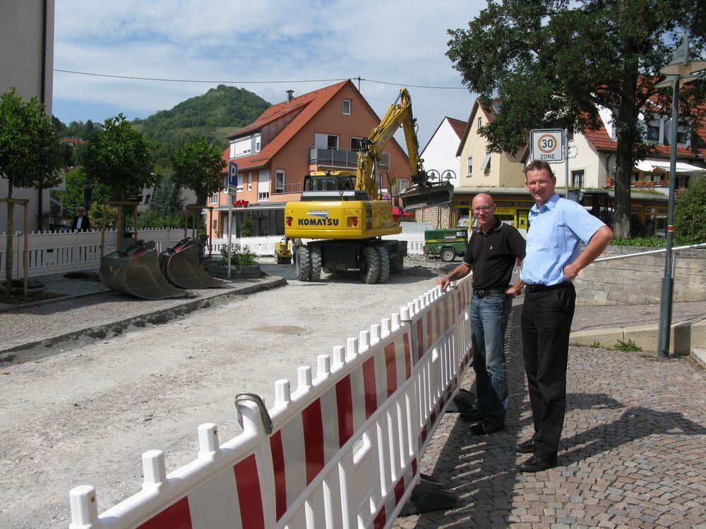 Grund für die Verkehrsbehinderung: Die Straße vor dem Rathaus wird saniert und Ortsbauamtschef Axel Girod und Bürgermeister Alexander Schweizer (von links) sehen es mit Wohlgefallen.