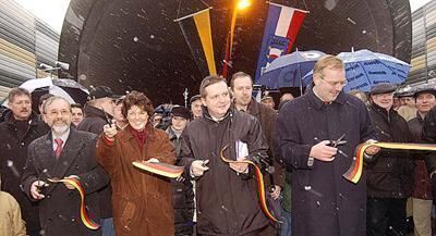 Bei der Eröffnung der neuen Bundesstraße 312 in Pfullingen an Scheren und Absperrband in den Bundesfarben (von links): Rudolf Heß, Ute Vogt, Stefan Mappus und Hubert Wicker. Es blieb gestern bei diesem symbolischen Akt.