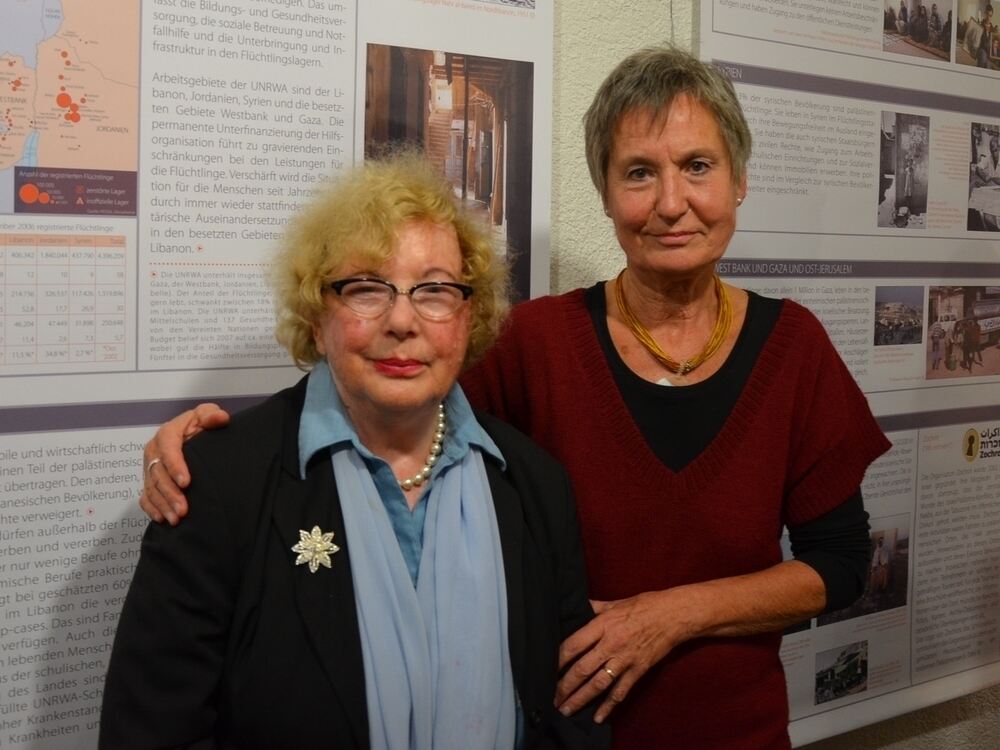 Felicia Langer (links) und Ingrid Rumpf vor den Tafeln der Ausstellung »Die Nakba – Flucht und Vertreibung der Palästinenser 1948«, die bis zum 23. November in der Stadtbücherei Pfullingen zu sehen ist.