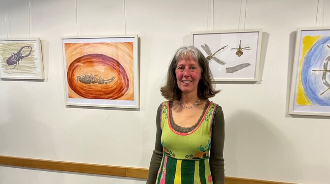 Hirschkäfer Adelbert hat Gabriele Eberspächer gleich zweimal in Bildern verewigt, zu sehen jetzt in der Ausstellung im Pfullinger Bürgertreff. FOTO: SCHEURER