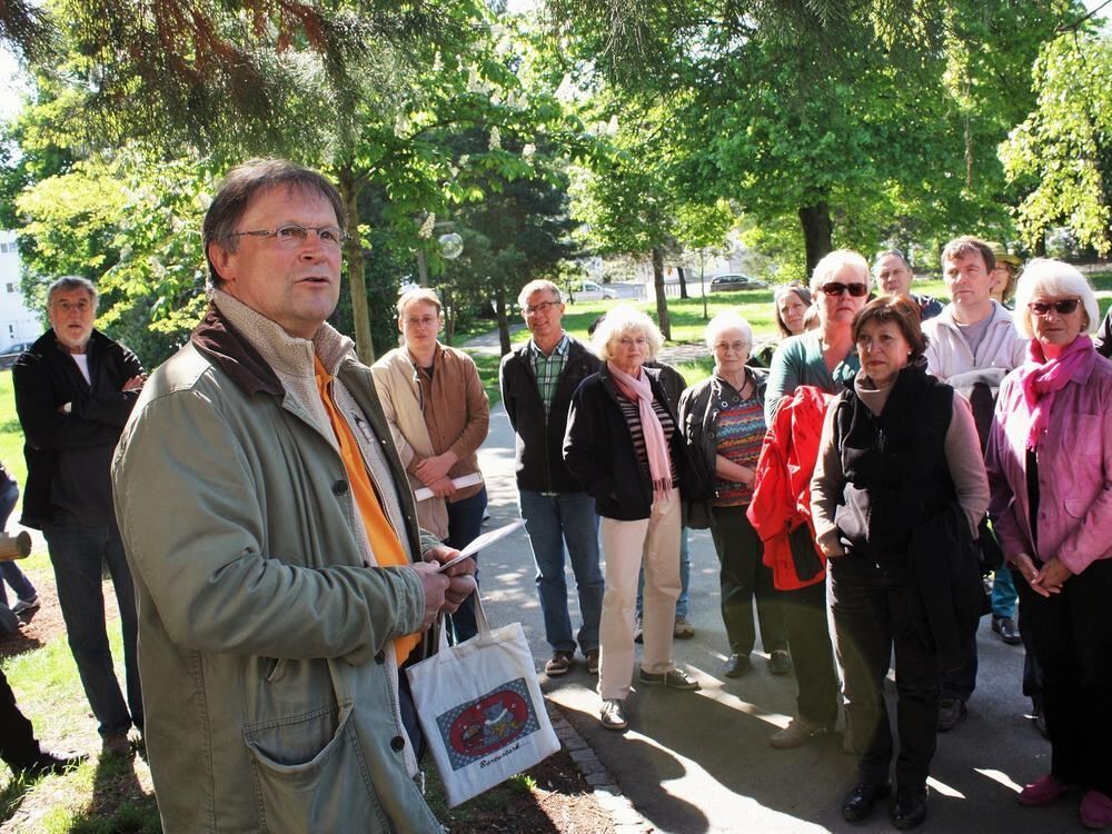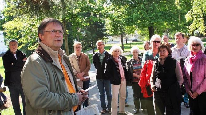 Unterwegs auf Helmut Bachschusters Rappen: Knapp 60 Interessierte schlossen sich dem kommunalpolitischen Rundgang an. Foto: Christoph B. Ströhle