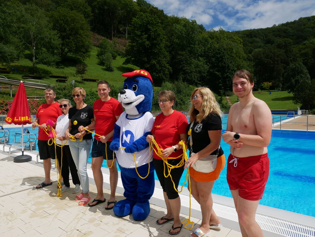 Gruppenbild mit Narren, DLRG, Robbe Nobbi, Bürgermeister und »Rettungsopfer« im Eninger Freibad.