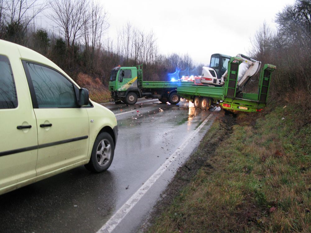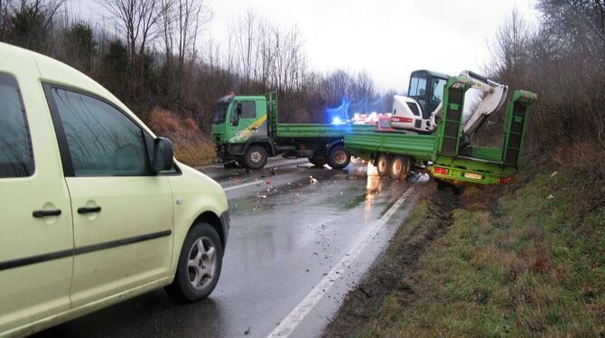 Bagger auf Lkw-Anhänger kommt ins Rutschen