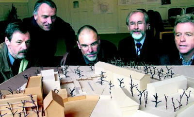 Das Schiller-Gymnasium als Modell; links der C- und B-Bau, der Schulhof mit der unterirdisch angelegten Mensa in der Mitte, rechts der A-Bau mit dem sich anschließenden neuen Querbau. Zufrieden auf die Planung blicken (von links): Architekt Thomas Preusch, Rektor Hartmut Seeger, Architekt Albert List, Bürgermeister Rudolf Heß und Stadtbaumeister Karl-Jürgen Oehrle.