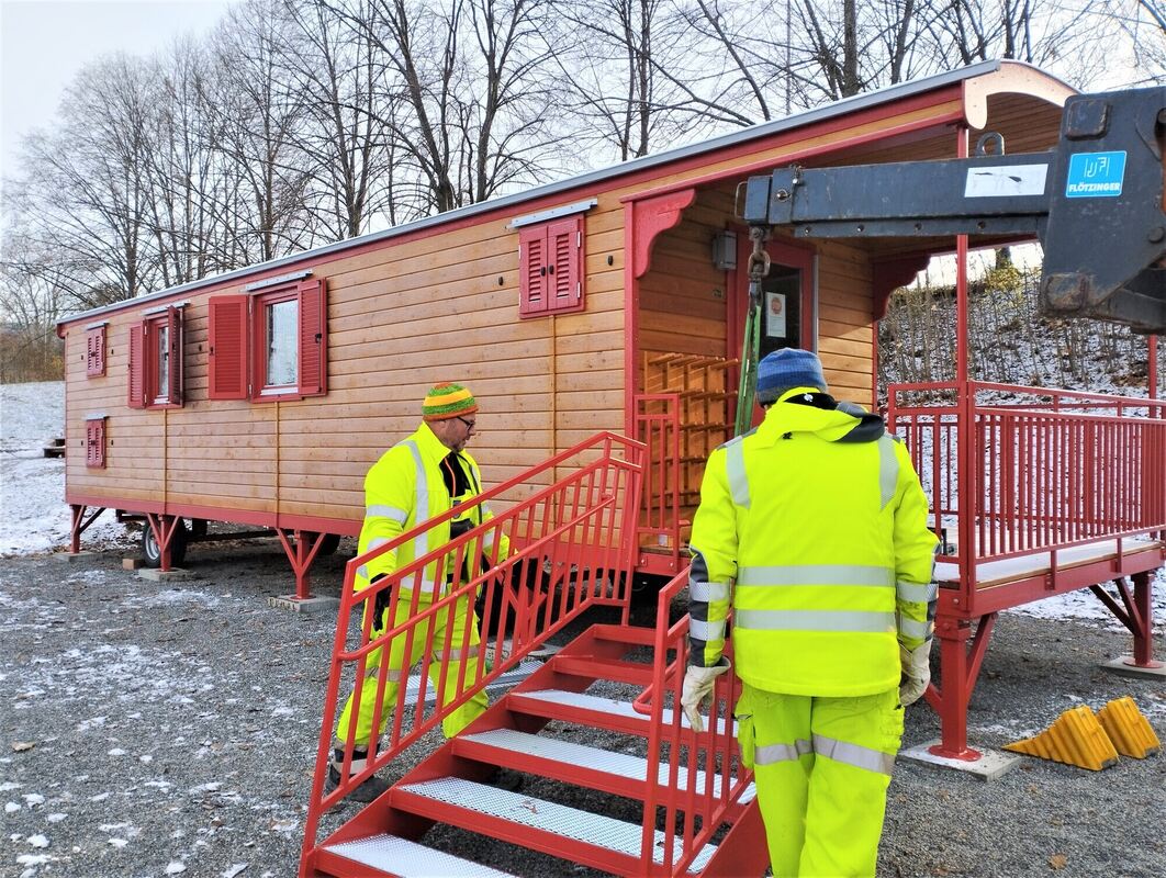 Am Dienstag haben Mitarbeiter des Bauhofs die Treppen an den neuen Bauwagen des Naturkindergartens »Unterm Himmel« montiert.