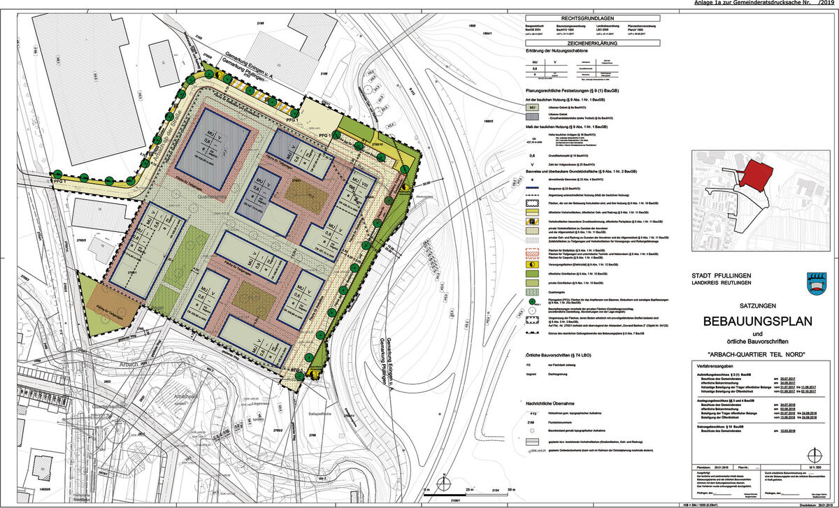 Der Bebauungsplan des künftigen Stadtteils »Arbach-Quartier Nord« ist jetzt als Satzung beschlossen. Jetzt könnten die Baugesuche für die Gebäude (blau umrandet) eingereicht werden. Rechts ist der Eninger Zubringer zur B 312 zu sehen, links grenzt das Areal an das Industriegebiet »Arbach ob der Straße«. In den blau schraffierten Abschnitten soll Einzelhandel möglich sein. GRAFIK: STADT PFULLINGEN