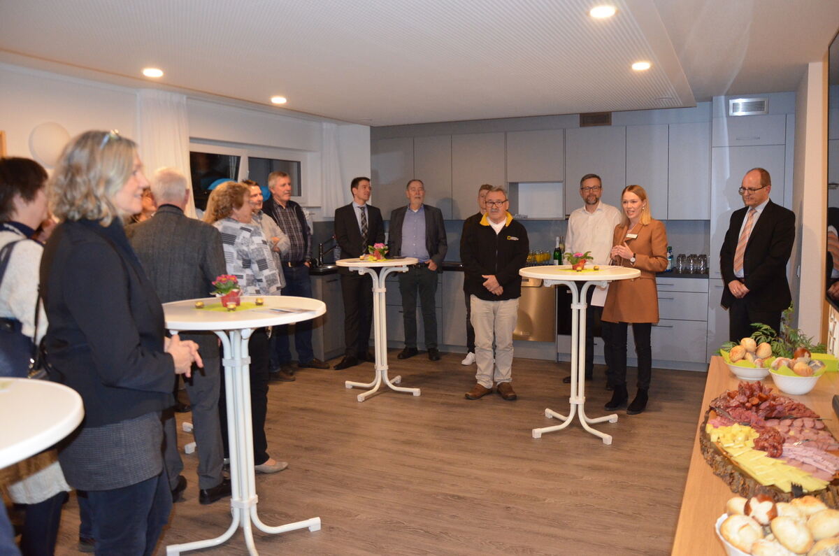 Zur Eröffnungsfeier des Treffs Jahnstraße 9 kamen auch einige Anwohner. Bürgermeister Michael Schrenk (von rechts) ist Schirmherr, Hanna Schmid koordiniert die Quartiersarbeit, Martin Grado sprach für die Baugenossenschaft Pfullingen, die Raum zur Verfügung stellt. FOTO: PS