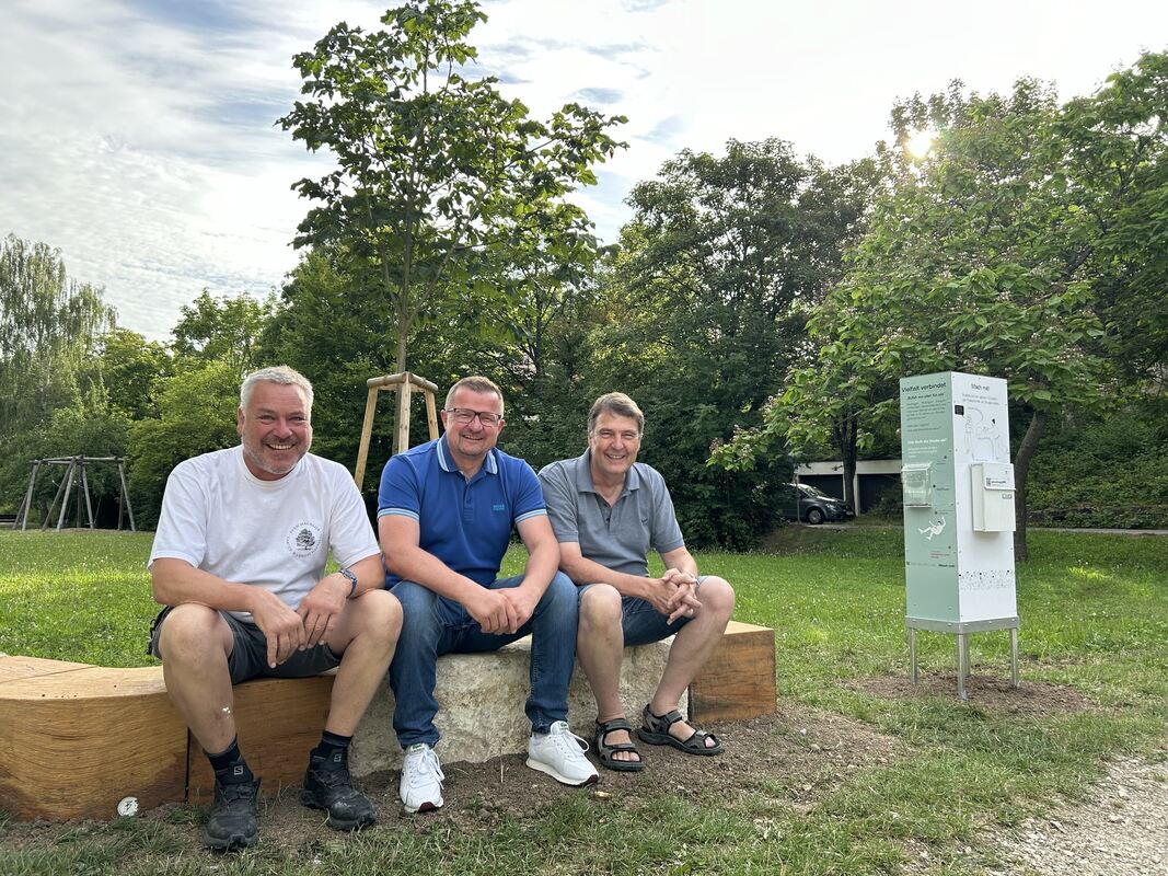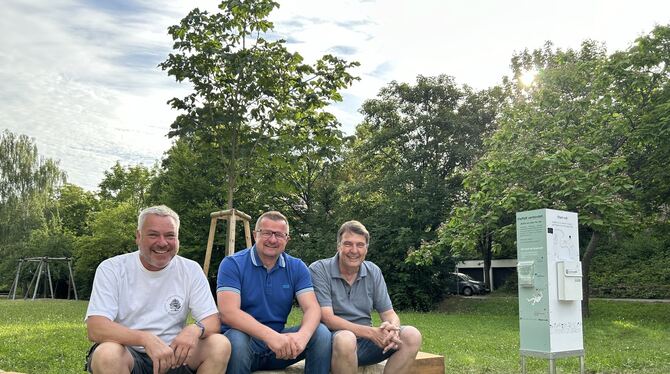 Am Freitagmorgen weihte Bürgermeister Stefan Wörner gemeinsam mit Sven Hagmaier und Thomas Mürdter die neue Buga-Bank ein. Die beiden Pfullinger Garten- und Landschaftsbauer haben das Ensemble im Bahnhofsanger mit Buga-Baum, Buga-Bank und Buga-Kasten maßgeblich gestaltet, für die Holzelemente der Bank zeichnete der Pfullinger Kettensägenkünstler Billy Tröge verantwortlich. (pm)