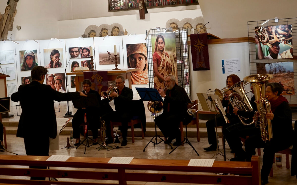 Konzert in der Ausstellung: Der Bläserkreis des Kirchenbezirks Reutlingen musizierte am Sonntagabend in der Fotoschau »Ich sehe Dich«, die derzeit in der Eninger Andreaskirche gezeigt wird. FOTO: LEIPOLD