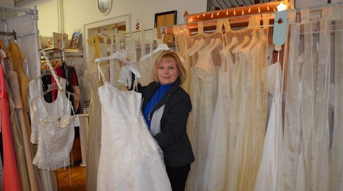 Gunda Schneiderbauer in ihrer Braut- und Abendmoden-Boutique in Pfullingen: Für intensive Beratung ohne Kleiderkauf verlangt sie seit Jahren eine Gebühr und fährt gut damit. GEA-FOTO: SCHÖBEL