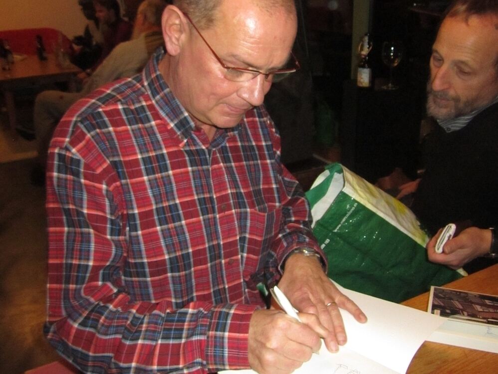 Autor Bernd Weiler signiert sein neues Werk, den Krimi »Leberkäsweckle«. FOTO: PR